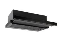 Vestavná digestoř výsuvná, jediná na trhu s odtahem dozadu nebo nahoru (oba 120 mm), šíře 60 cm, černá, max. výkon 338 m3/h (15 Pa), hlučnost Lw 56 – 71 dB(A), 3 rychlosti, odsávací jednotky mají individuálně vyvažovanou turbínu, motory jsou opatřené vratnými tepelnými pojistkami (při přetížení motoru vypne, po jeho vychladnutí opět sepne), mechanické posuvné ovládání, kovové sendvičové tukové filtry, které lze mýt v myčce, možnost práce v odtahovém i recirkulačním režimu, Výbava: úsporné LED osvětlení 1 × 2,8 W (LED pásek), zdarma zpětná klapka Recirkulační režim u vestavných digestoří: Digestoř se osadí uhlíkovým pachovým filtrem. Přefiltrovaný vzduch se z digestoře odvádí obdobně jako u odtahového režimu trubkou, která prochází celou skříňkou. Tato trubka však neústí kolenem do zdi, ale nad skříňku, kde ji doporučujeme zakončit mřížkou. Pro výrobu skříňky je směrodatný rozměrový nákres a údaje v něm uvedené. Fotografie digestoří jsou ilustrační.
