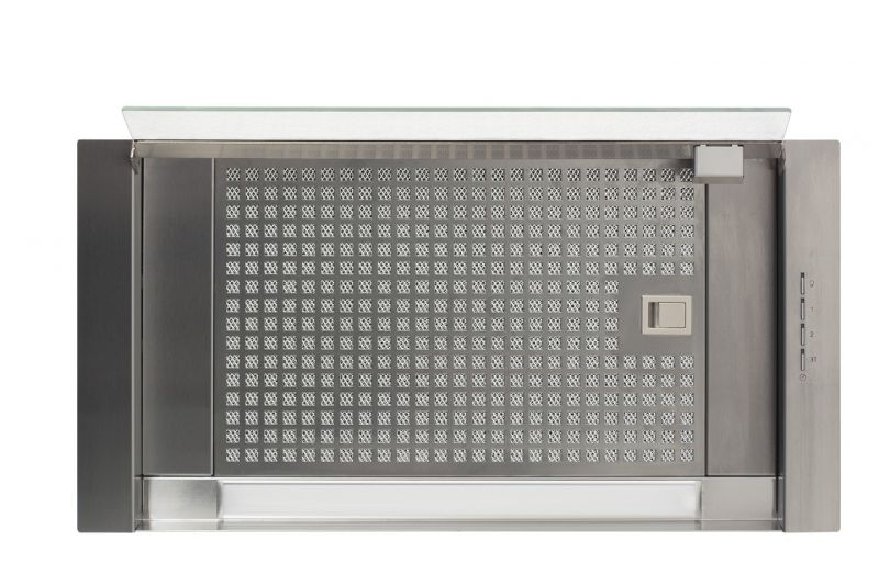 Neviditelná vestavná digestoř, 600 mm, nerez / sklo, elektronické ovládání VL3, 3 rychlosti (2 + Turbo), max. výkon 850 m3/h (5 Pa), hlučnost Lw 50 – 67 dB(A), max. tlak 470 Pa, 15 min. časovač, kovové sendvičové tukové filtry, které lze mýt v myčce, výstupní průměr 150 mm, možnost práce v odtahovém i recirkulačním režimu, snadná montáž, Výbava: osvětlení úsporným LED páskem 3,5 W, výklopné skleněné stínítko pro zvětšení plochy odsávání a pro ochranu dvířek skříňky.