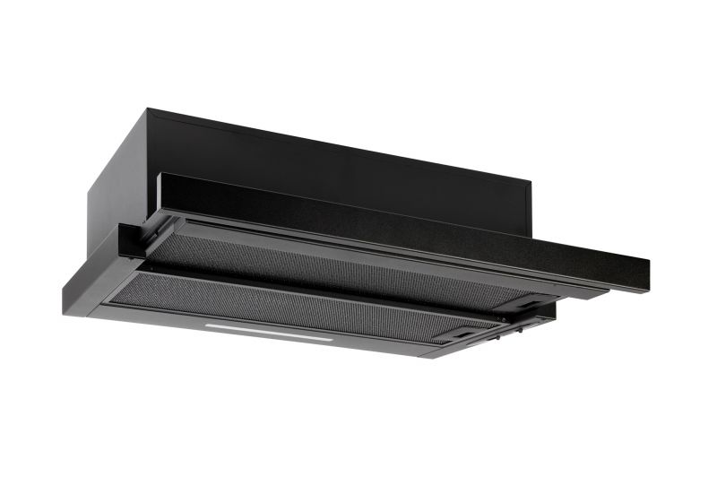 Vestavná digestoř výsuvná, jediná na trhu s odtahem dozadu nebo nahoru (oba 120 mm), šíře 60 cm, černá, max. výkon 338 m3/h (15 Pa), hlučnost Lw 56 – 71 dB(A), 3 rychlosti, odsávací jednotky mají individuálně vyvažovanou turbínu, motory jsou opatřené vratnými tepelnými pojistkami (při přetížení motoru vypne, po jeho vychladnutí opět sepne), mechanické posuvné ovládání, kovové sendvičové tukové filtry, které lze mýt v myčce, možnost práce v odtahovém i recirkulačním režimu, Výbava: úsporné LED osvětlení 1 × 2,8 W (LED pásek), zdarma zpětná klapka